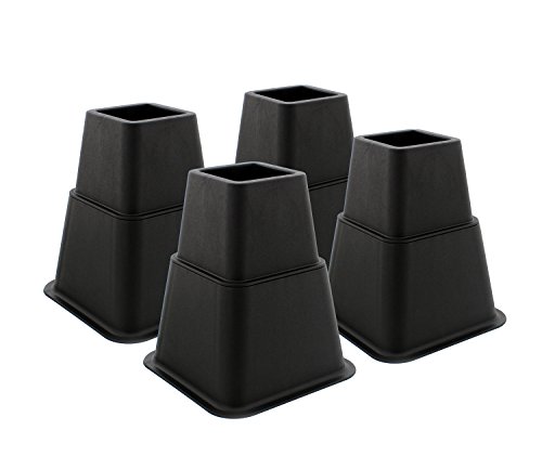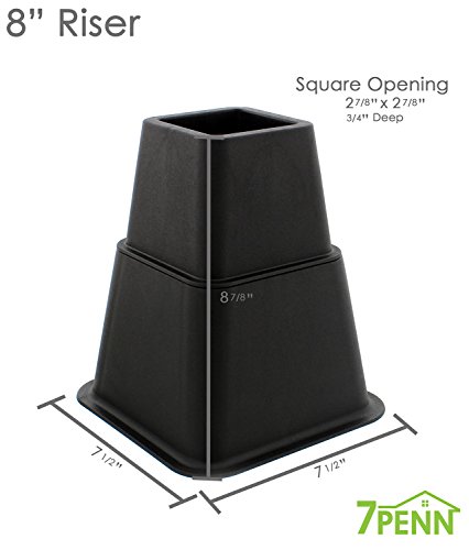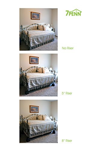 Studio : 7Penn Publisher : 7Penn Product Description The 7Penn Bed Riser Set will safely raise your furniture to the height you desire. Use the 4 small risers to give your furniture 3" of additional height, use the 4 large risers to give your furniture 5" of additional height, or stack the 3" and 5" risers to give your furniture 8" of additional height. They are completely customizable and adjustable to fit any bed, chair, couch, or coffee table. Create more room for under bed storage, make it easier for elderly to get in and out of a chair, and keep your sheets from hitting the floor so bed bugs can't crawl directly from the carpet to your sheets. Most wooden or metal legs and caster wheels fit securely into the 3" x 3" x 3/4" (7.6cm x 7.6cm x 2cm) deep built-in recess cups. This package includes 8 black risers: (4) 3" tall and (4) 5" tall. 0