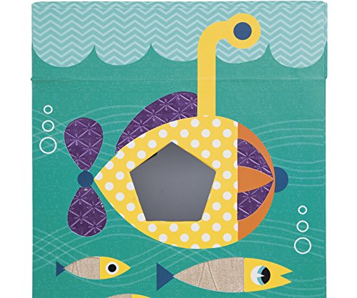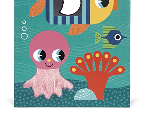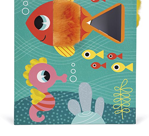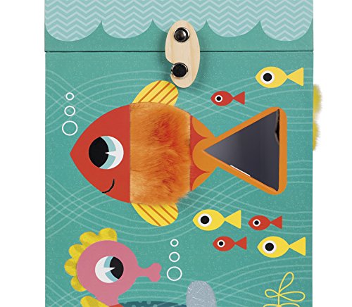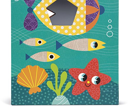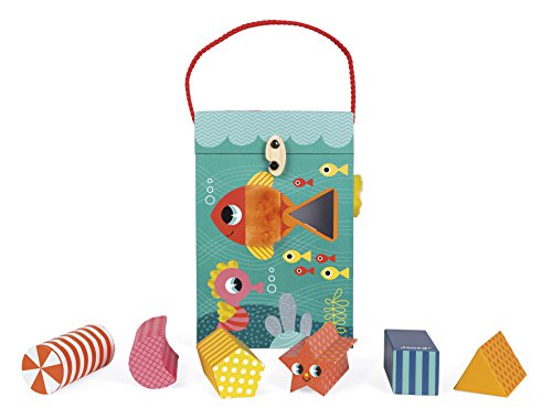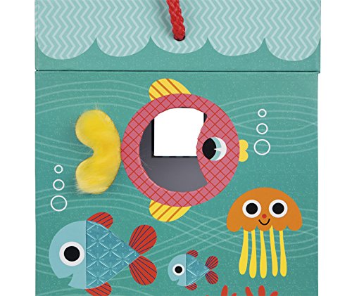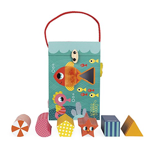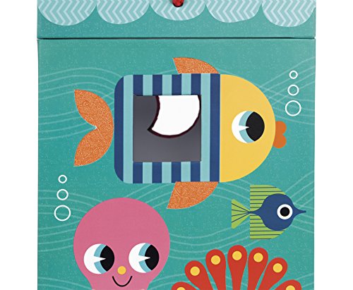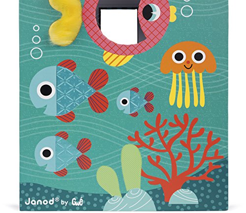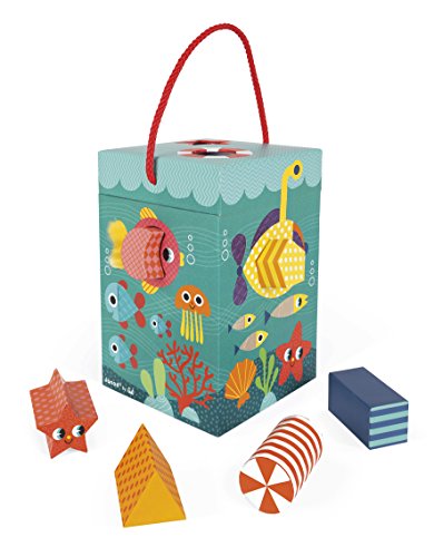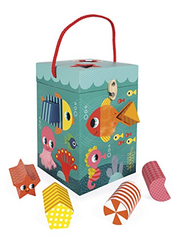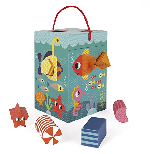 Janod ocean textures shape sorter is a cute and colorful way to learn! the adorable and durable thick cardboard box features an underwater scene with sea life who are textured and has 6 holes in different shapes. Your little underwater Explorer can touch the fish and sort shapes all day. The box measures 9in tall by 5.75in wide by 6in deep, hinges open at the top with a rope handle and a metal and wooden hook to close it. The cardboard shapes are all about 1.5in wide by 1.5in. Long by 2.75in deep. Recommended for children 1 to 3 years of age.Feature
