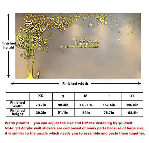 -. Feature : Note: the pictures displayed are for showing purposes only, the large size is in order to show all details of the product, not reflect the real size, please measure your wall to choose the most suitable size / As different computers display colors differently, the color of the actual item may vary slightly from the above images / Please be patient to DIY, there are so many piece and you have to stick them one by one, it is good idea to ask someone help you / Acrylic material,the thickness is 2mm. It can be stuck to any smooth surfaces such as walls, mirrors and windows / Back is self-adhesive, don't need extra glue. This acrylic wall sticker is a great idea to be decoration for living room, dinning room, bedroom, TV wall background, sofa backdrop, corridor, also can be served as artistic decoration