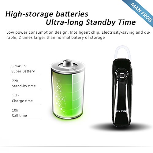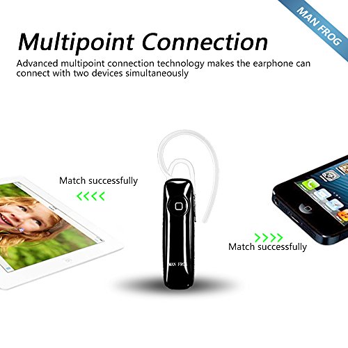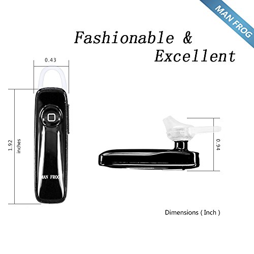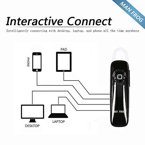 -. Feature : USA Brand Bluetooth Headphone, Super easy and fast paring with your smart Phone, PAD, Apple iPhone, Android Google Samsung Galaxy, Huawei, LG, Windows Phone Lumia, PC Laptop and other Bluetooth device; / Fits comfortably in either ear with a super soft gel ear tip, Noise-cancelling microphone, Multipoint technology, LED battery status indicator; / Deep Sleep mode extends battery life ( up to 72 hours standby time ), effective distance up to 30 feet; / Retail Packaging includes: Headset, Ear hook, USB Charging cable, Operating instructions, Case Color is Black; / Fully Charger the Bluetooth Headset before You Use it, use any cell phone socket ( 5V output, iPhone, Android, Windows ) to charger it. When you do the first time pairing with your phone, please press and hold the headset Answer/End button until Blue and Red lights were flashing alternately, choose and accept your MAN FROG Bluetooth headset model by pressing 'Yes' or 'OK' on the phone, they will automatically connect it from Second time.