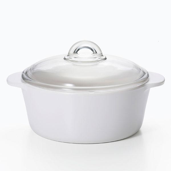 | セラミックコーティングを施したスタイリッシュなガラス製鍋です。直火、オーブン、電子レンジで使用可。こびりつきにくく、お手入れも楽々です。 |