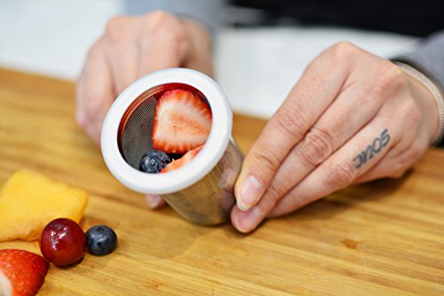 - Made of strong, lightweight, heat resistant, Borosilicate Glass. One year warranty. Satisfaction guaranteed! Durable Stainless Steel filter for your tea steeping and fruit infusions. Easy to clean and dishwasher safe.