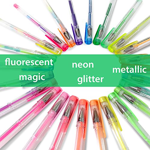 - Unique color variation, we passionate about gel pens and know that you'll need more colors for your coloring artwork, we present a good quality gel pens contains of 100 unique colors, no duplicate (include: fluorescent, magical, metallic, neon, standard, neon glitter and glitters).This set will give you huge choices of colors plus 100 refills for your convenient coloring art kit.