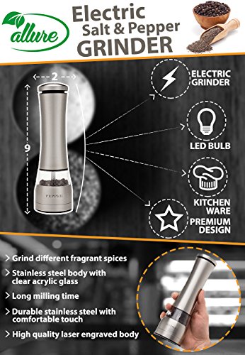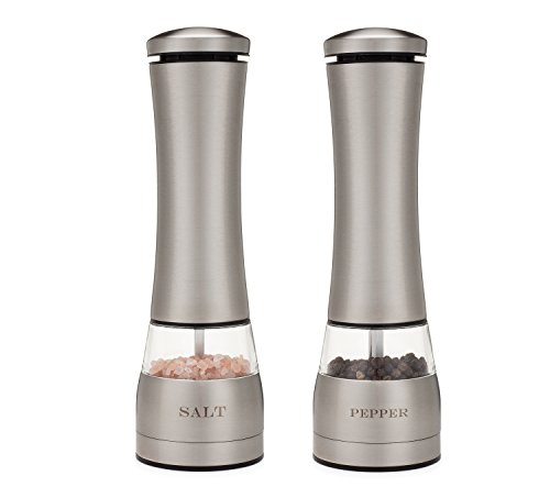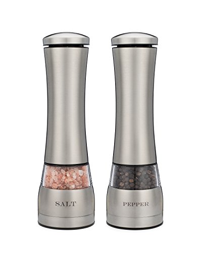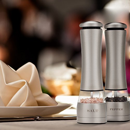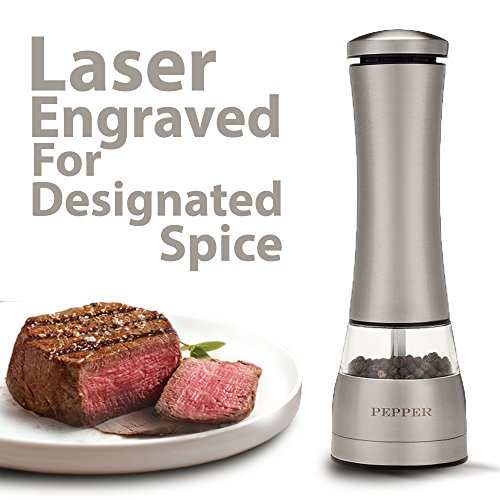 ? PREMIUM ENGINEERED ELECTRIC SALT PEPPER SHAKERS SET is just what you need to enjoy amazing reliability, control, and the fresh exhilarating taste of newly ground salt and pepper with each meal or cooking experience. Many people keep this set in their kitchen to get perfect portion control with the built-in LED light even in dim rooms you will have total control. ? ? NO MORE WRIST WRENCHING AND TWISTING. Just press the button and the electric salt and pepper grinder set goes to work for you. Use the built in LED light in dim environments for the exact amount you want. No more over salting or peppering your food. Why didn't someone think of this before? ? BULT IN WINDOWS show you when to refill. It also helps you identify the shaker at a glance. Never again pick up the pepper when you wanted the salt. We also laser etch SALT and PEPPER on each salt and pepper grinder set. ? Make the best choice with this set of two electric salt and pepper grinders. ? - Grinding mechanism can be adjustable from fine to coarse.