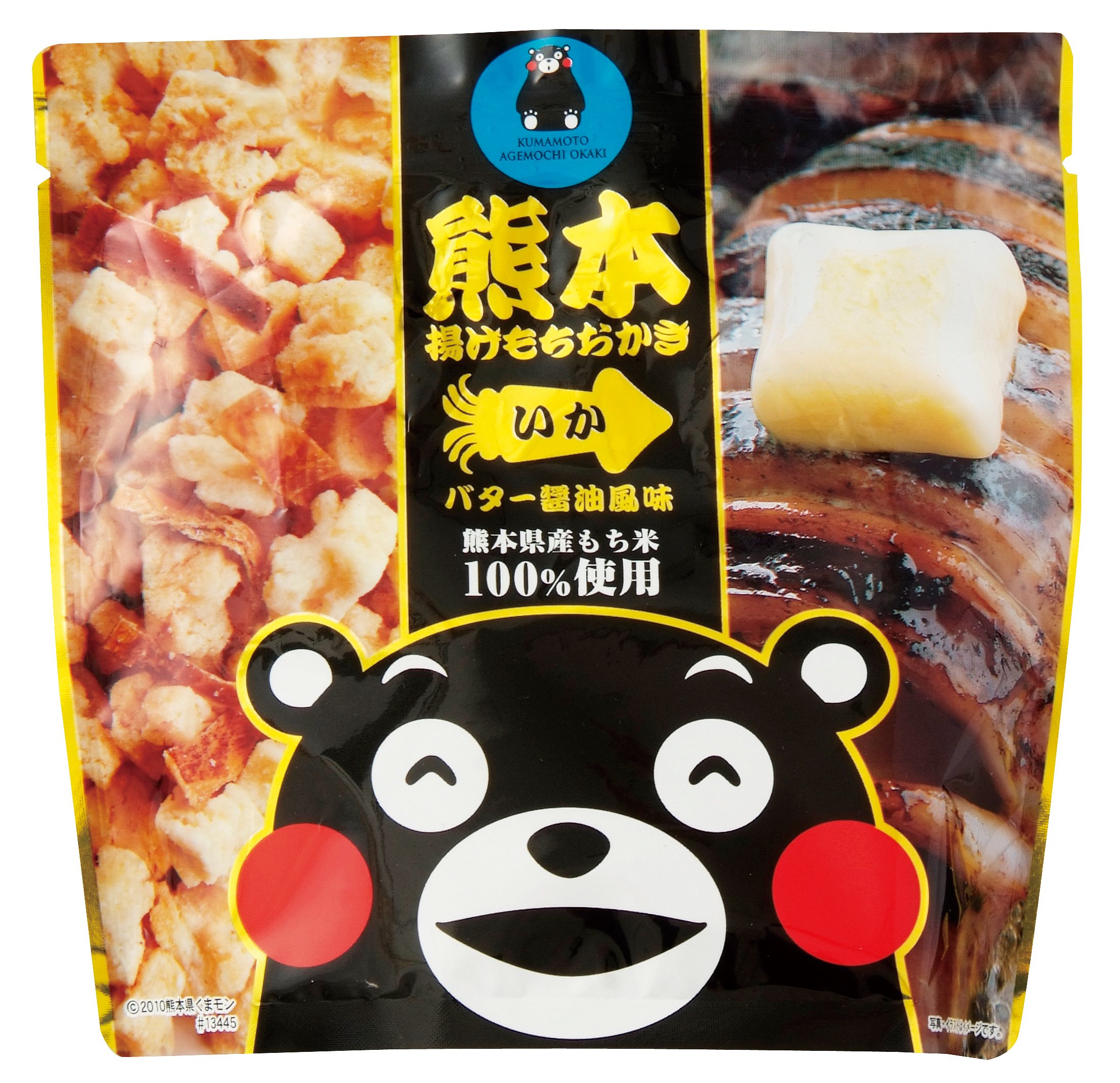 I made seafood deep fried rice cake which used 100% of glutinous rice rice in Kumamoto prefecture to butter soy sauce flavor with a package that printed a popular wimamon all over.