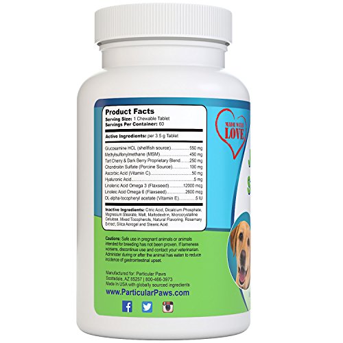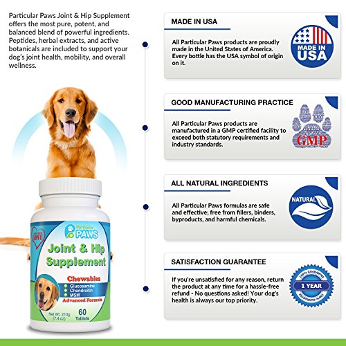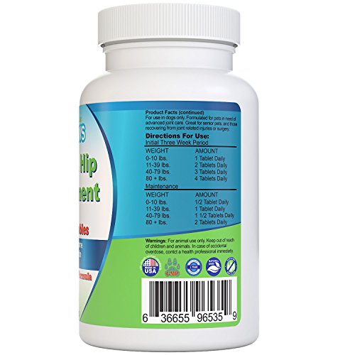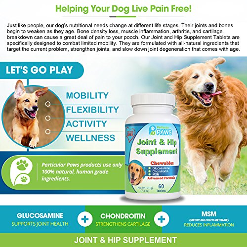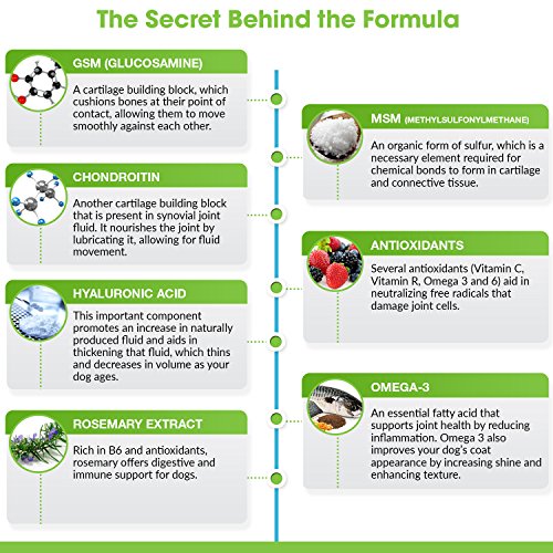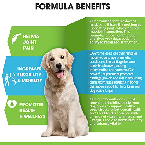 RELIEVES JOINT PAIN & IMPROVES MOBILITY: Help your dog get back to living an active, pain free lifestyle with this advanced joint and hip supplement. Specially formulated with Glucosamine, MSM, Chondroitin, Vitamins C & E, Hyaluronic Acid, Omega 3 & Omega 6 to regenerate damage, lubricate joints, reduce inflammation, and put a pep in your dog's step again! Say goodbye to your dog's limping, stiffness, and sore joints. Instead say hello to long walks and puppy-like playtime.