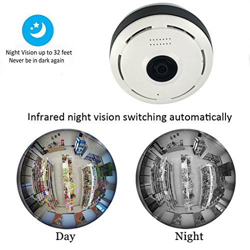 -. Feature : ADVANTAGES: Pet monitoring, nanny cam, business monitoring, security, vacation home monitoring, senior monitoring, remote live video streaming via Smartphone, download the free APP to view anytime anywhere. / SUPER WIDE VIEW ANGLE: 360 degree fisheye Wi-Fi IP camera without blind spots. This 360° Wi-Fi camera keeps an eye on every corner in your home/store/office, never miss anything happened in the monitoring area. This one is enough for your home security. / MOTION DETECTION: Get informed about every movement in your house via E-mail, FTP or store the alerts on Micro SD. The motion detection sensors "feel" it when something is moving in the room and will let you know immediately. Perfect for surveillance. / POWERFUL FUNCTIONS & SMART CONTROLS: 3PCS dot IR light for up to 65ft, the night vision works automatically during the low light, when the motion detection is triggered, an email will be sent to your Smartphone instantly, the IR cut function provides you the 1280x720P vivid images, H.264 High Profile compression saves the code rate and ensures the HD image quality. / EASY TO USE: Quick WiFi setup via IOS or Android Smartphone using supplied APP, Remote access to the camera on Smartphone. Loop recording: When the memory full, it will auto cover the oldest video files.