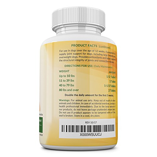 - Dog joint supplement comes in tasty, chewable tabs for easy ingestion.