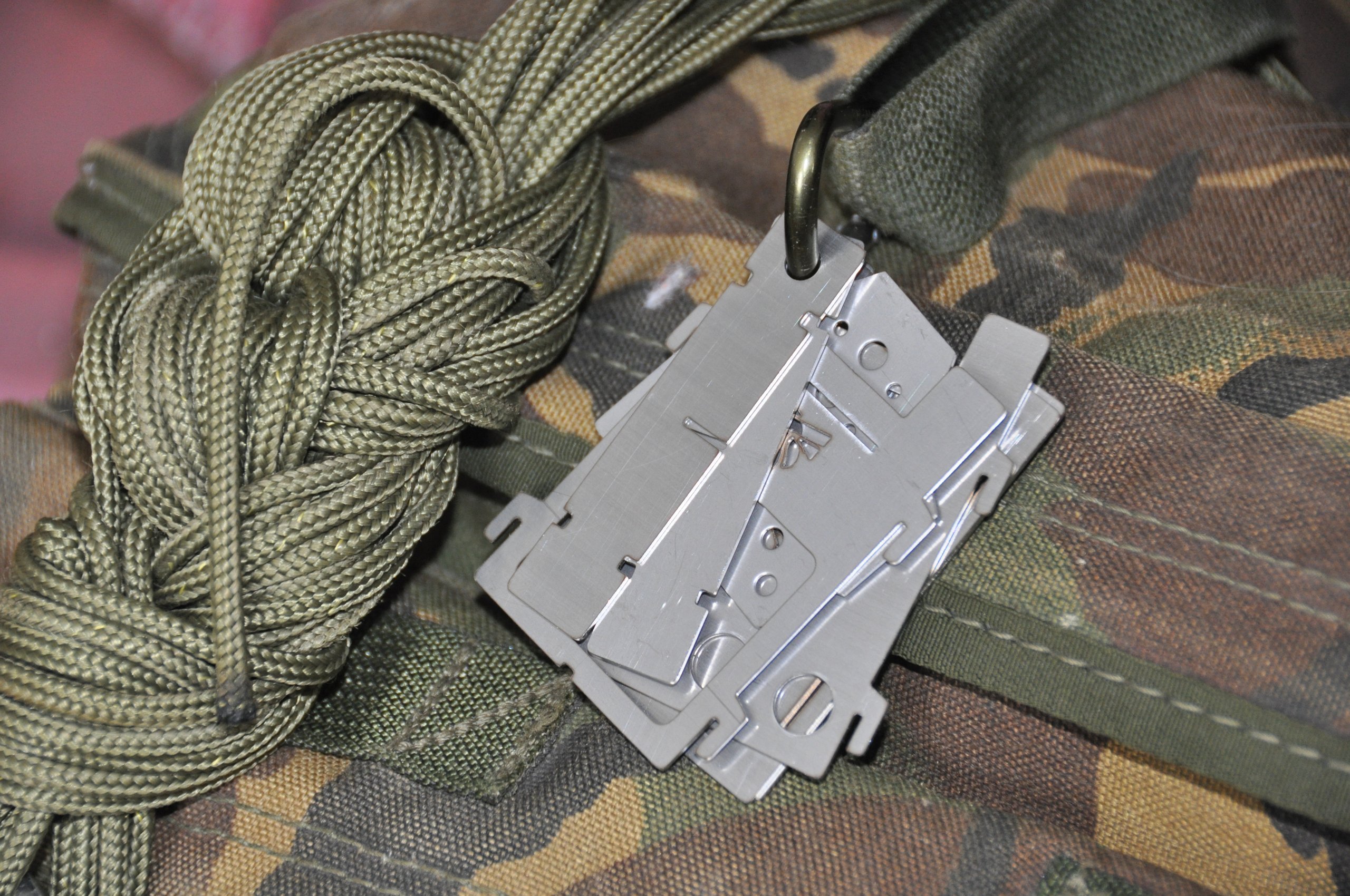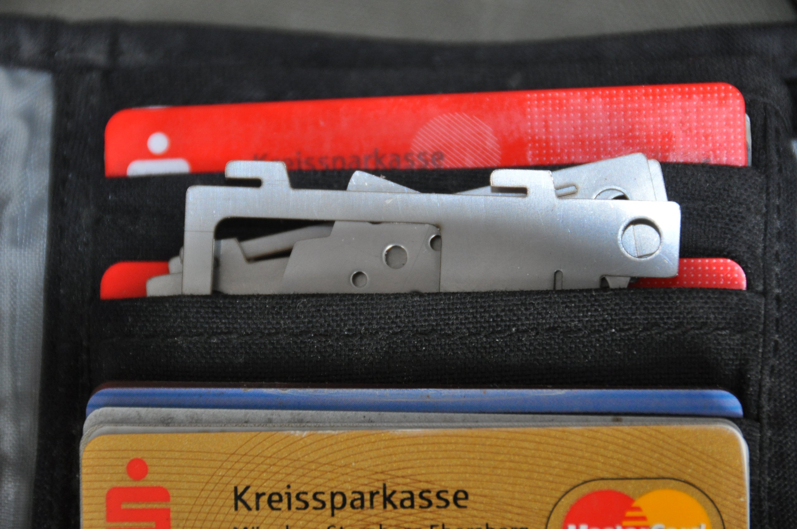 It can be stored in a wallet or pocket, and all the parts have a hole to pass through the carabiner.