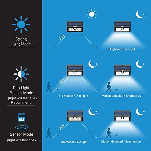 1.Strong Long Light Mode: When it fades into darkness, the light will keep strong and bright until the environment becomes bright. 2. Dim Light Sensor Mode: When in dark night, the light will be dim without people coming near. If people comes, it will brighten up, and the bright light will last 15 seconds until it returns to dim light again. 3.Strong Light Sensor Mode: At night, the light will be strong bright when people comes, and then 15 seconds later, the light dies out automatically.