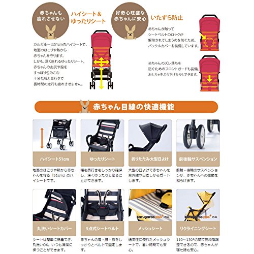 ●カルガルーは51cmのハイシートで千綿の埃や熱からお子様を守ります。しかも、深く座れるゆったりシートです。お子様のお尻や股をすっぽり包み込みます。●お子様が誤って触ってシートベルトのロックが解除されてしまうのを防ぐためバックルカバーを装備しています。●お子様のズレ落ちを防ぐためのフロントガードを装備●サイズ:44.5×83×101.5cm●製品重量2.8kg●材質:アルミ、ポリエステル、ポリプロピレン●対象月齢:7ヵ月~36ヵ月迄●制限体重:15kg迄●座席幅32.5cm●バスケット容量:12L(耐荷重5kg)Feature
