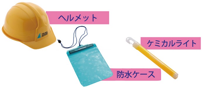 付属品3点の「ヘルメット」・「ケミカルライト」・「防水ケース」