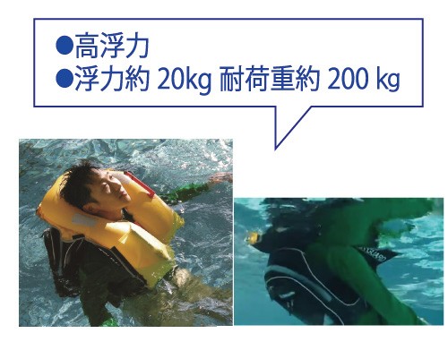 高浮力を保ちながら救助を待つことができます、また頭部を水面上に出し、安心して浮いていることができます。