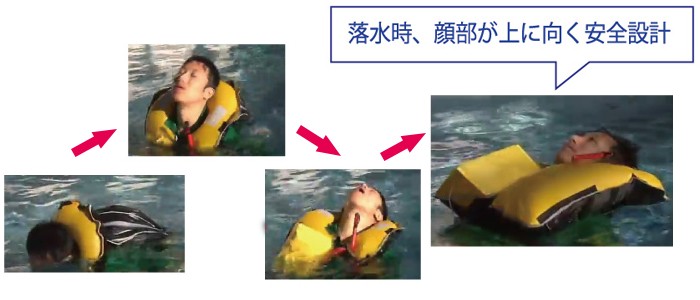 ●落水時、顔部が上に向く安全設計…"万が一気を失っても自動的に気道を確保"
