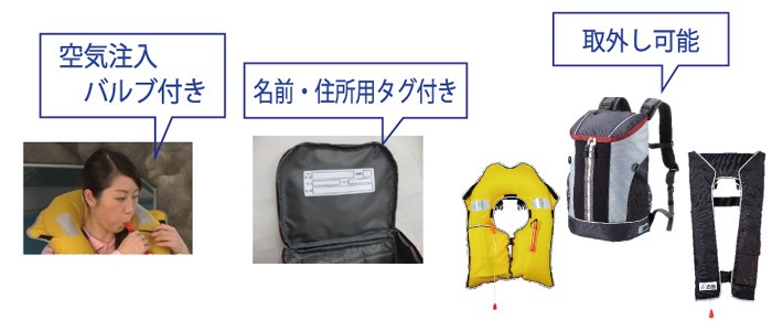 ●本製品は救命具としての機能を優先させるため、リュックの一部分に浸水生地を使用しています。浸水により機能しなくなる恐れがある精密な機能をもつ製品などの収納はなるべく避けてください。書類や避難グッズなどは付属品の防水ケースに収納してください。