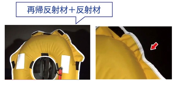 ライフジャケット部分、リュック部分至る箇所に再帰反射材を使用しており、遭難時が夜間の場合でも、光を反射します。それにより発見を早め、救命に役立ちます。