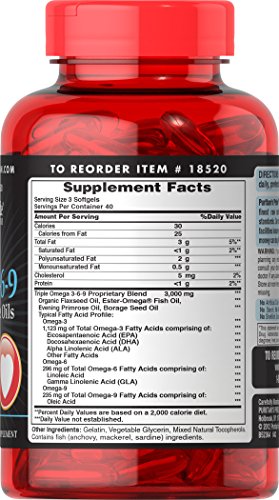 Omega 3-6-9 is an all-inclusive formula is reinforced with 3 different types of omega fatty acids � Omega-3, Omega-6 and Omega-9 � the �good� fats important for heart and metabolic health.** Fatty acids, particularly Omega-3s, may help support joint and skin health.** In addition to all these good fats, Triple Omega 3-6-9 contains a proprietary blend of essential oils, including Flaxseed Oil, Fish Oil, Evening Primrose Oil and Borage Oil, and is a good source of Vitamin E. Omega 3-6-9 is one of the best ways to support cardiovascular function.** ** These statements have not been evaluated by the Food and Drug Administration. These products are not intended to diagnose, treat, cure or prevent any disease.Feature