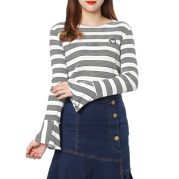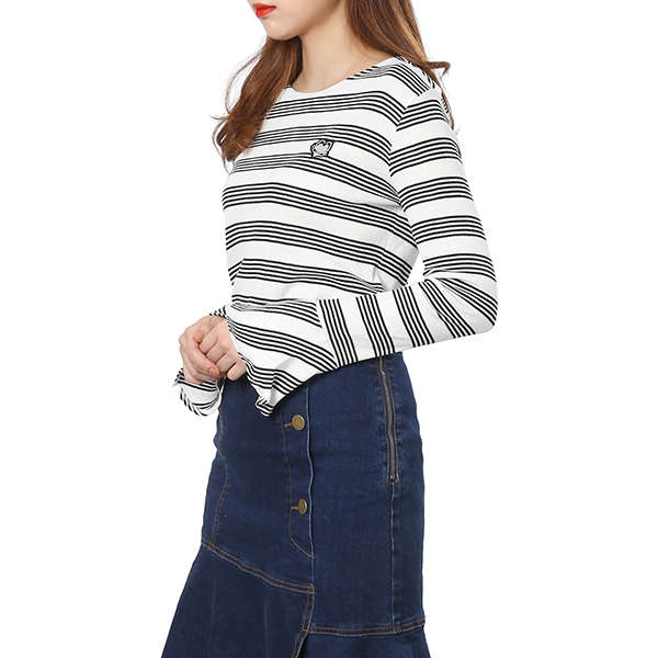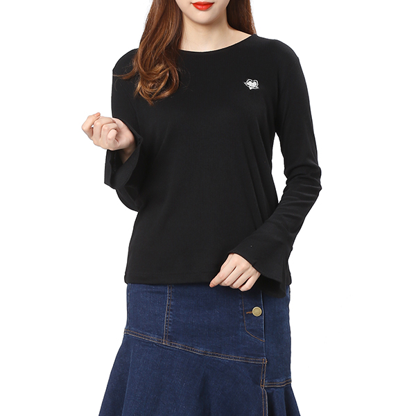 골지 티셔츠로 슬림한 핏 라인을 연출해 줍니다. 소매 러플 디테일과 로고 패치 장식으로 포인트를 주었습니다