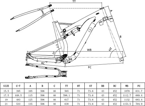 Studio : ICAN Publisher : ICAN Product Description ICAN 29er Mountain Bike Suspension Carbon Frame Finish: UD matte Frame Size: 15.5/17.5/19/21 inch Wheel Size: 29er Seat Post Size: 31.6mm Seat Post Clamp Size:34.9mm Headset: Top 1-1/8" , Down 1-1/2" Bottom bracket: BSA Shock size: 165x38mm Suspension travel: 110mm Headset : Top: 1-1/8" , Down:1-1/2" Brake: Disc Brake Weight: 2135g-17.5 Inch; 2180g-19 Inch Axle: 135x9mm/142x12mm Geometry Size 15.5inch(you can see other size geometry on the photo) Top Tube (effective): 565mm Seat Tube (BB Center to Top): 395mm Chain Stay (actual): 452mm Seat Tube Angle: 73.6¡a Bottom Bracket Drop: 43mm Head Tube Length: 105mm Head Tube Angle: 71¡a Fork offset: 46mm Wheelbase 1079mm Package included: Frame 0