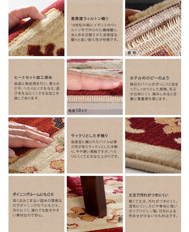 商品について:高密度なウィルトン織りで仕上げられたラグです。高密度に織られ、弾力性がありサックリとした手触り。ヒートセット加工を行うことでへたりを抑え、遊び毛が出にくくなりました♪床暖房、ホットカーペット対応