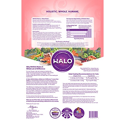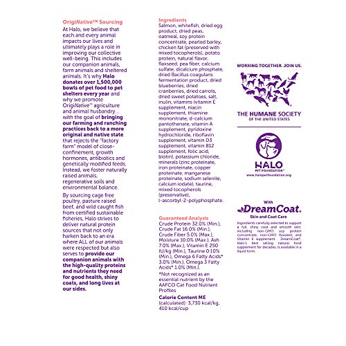 Halo uses WHOLE meat, never any "meat meal" of ANY kind in our natural cat food. Halo cat food is now made with Dream Coat—fatty acids from non-GMO plant sources and Vitamin E—to support healthy skin and shiny coat. We also have cat food options for special diets, including kitten food, indoor cat food, senior cat food, grain free cat food, and sensitive stomach cat food. At Halo, WHOLE Makes a Whole Lot of Difference is the philosophy that drives our holistic approach to ingredient sourcing, recipes, nutritional value, the welfare of ALL animals, and our overall mission to change the way companion animals are fed and farm animals are raised…for the better!.