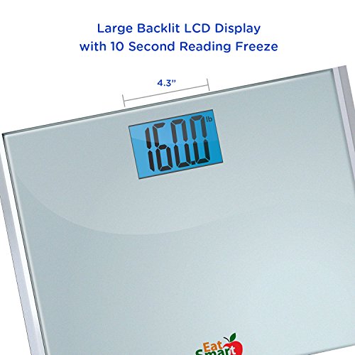 The EatSmart Precision Plus Bathroom Scale is the ideal way to track your weight loss quickly and easily. EatSmart's proprietary "Step On" technology allows you to simply step onto the scale and in seconds you'll have an accurate readout to the nearest .2 lbs on the EatSmart's oversized 4.3" LCD display. No more "waking up" your scale by tapping or pressing buttons! The LCD display also contains a cool-blue backlight, allowing for easy viewing even in the most dimly light areas of the bathroom or home. The EatSmart Precision Plus is also not only easy to use but also extremely accurate, engineered to the highest precision standards. The four high-gauge EatSmart precision G sensors ensure that you will get an accurate measurement every time. Additionally the slim, ergonomic design fits perfectly into any surroundings and oversized non-slip platform safely allows weights to 440 pounds (one of the highest capacities on the market). At over 15 inches wide this scale will fit even the biggest people comfortably.< Along with your EatSmart digital scale you also receive our easy instruction guide and 2 AAA batteries. Stop guessing your weight and get serious about your weight loss and fitness goals. Get yours today!Feature