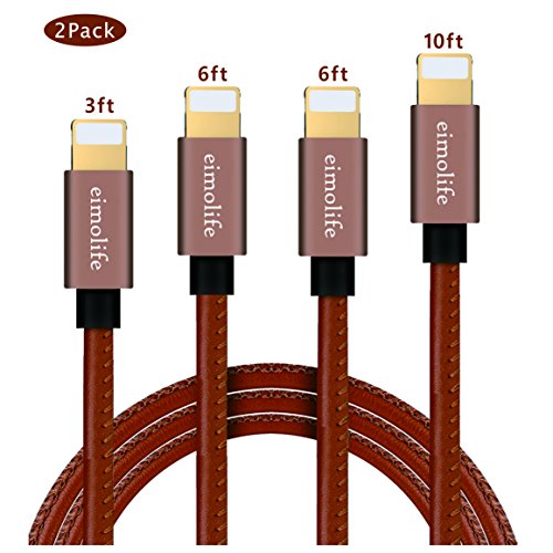 -. Feature : Universal Compatibility: The charging cable ensures complete charge and sync compatibility with iPhone 8/8 Plus7/7 Plus, 6/6S/6 Plus/6S Plus, 5/5S/5C/SE, iPad, iPod Nano 7 / Premium Leather Design: This premium leather Lightning Cable is more durable. Flexible and tangle-free: with a 6000+ bend lifespan several times longer than standard cables. / Sync & Charge: Gold plated USB and lightning port ensure unbeatable conductivity and corrosion resistance. Upgraded copper core makes charge faster, high speed to data transfer simultaneously. / Convenient to Use: 4 pack included(3+6+6+10 feet length).The 3 feet for the car, the 6 feet for the bedside or work and the 10 feet for the couch or travel. / WARRANTY: eimolife lightning USB cable with 1 year guarantee. All quality-related issues will be taken care with a REPLACEMENT OR FULL REFUND.