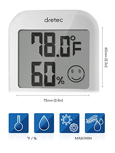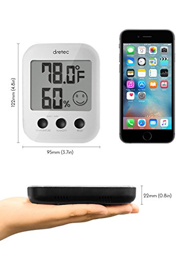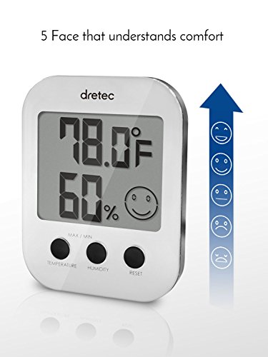 Product Description TOWARDS A COMFORTABLE INDOOR ENVIRONMENT: By providing accurate temperature and humidity measurements, our device enables you to better grasp the condition of your room. Room temperature and humidity are updated and displayed on the large screen every 10 seconds. Five easy to understand face icons indicate the level of comfort. You can aim to approach the most comfortable setting (indicated by a smiley face) by adjusting your room temperature and humidity levels. This product is recommend for households with baby and the elderly, as body temperature regulation can be difficult in these age groups. It is also perfect for households with pets. Also you can use it for keeping the instruments/guitar, cheese, greenhouse as well. ?RELIABLE JAPANESE DESIGN: Designed by the Japanese company dretec, which has an established reputation in the production of measuring equipment such as digital scales and timers. Our design features a large display allowing readings to be clearly visible from afar. The convenient 3WAY design with a neodymium magnetic back, retractable stand and hook for hanging allows for use in a variety of indoor environments inside your room. The stylish silver and black colors will surely complement your room interior. CONVENIENT FUNCTIONS: MAX / MIN readings storage function. Alternate between humidity monitor and temperature MAX / MIN monitor with the press of a button. Ready to use on arrival (starter AAA battery included). Thermo/Hygrometer MODEL NO. 0-230 COLOR : Silver UNIT : °F TEMPERATURE RANGE : -14~122°F HUMIDITY RANGE : 20-99%RH BATTERY : 1*AAA(Included) MATERIAL : ABS, Acryl PRODUCT SIZE : 95*22*122mm PRODUCT WEIGHT : 130g CTN Q' ty : 60 pcs CTN WEIGHT : 12.9kg CTN SIZE : 74.0*33.0*20.0cm