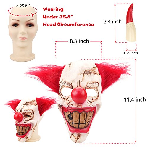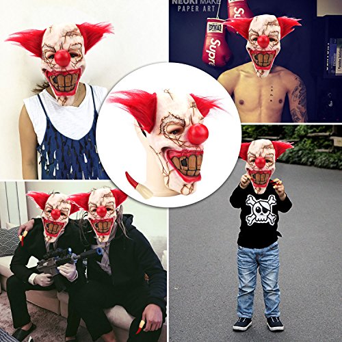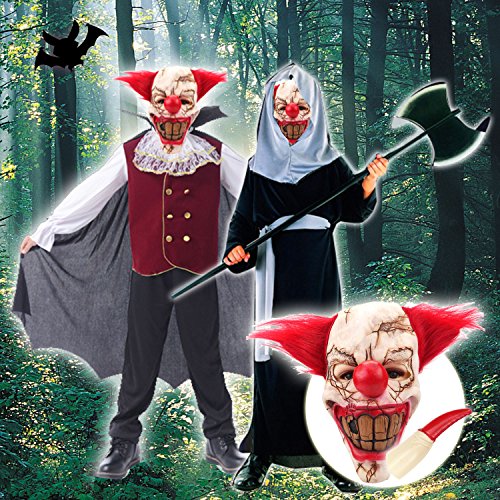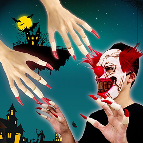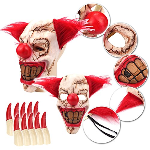 - SUPER Horror Party Cosplay Props: Latex clown mask and ghost finger claws, broken skull, brown big teeth, bloody lips, combined with an awful, creepy grin, bloody nails will camouflage you successfully to achieve your horror trip