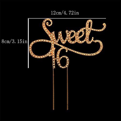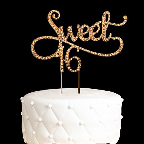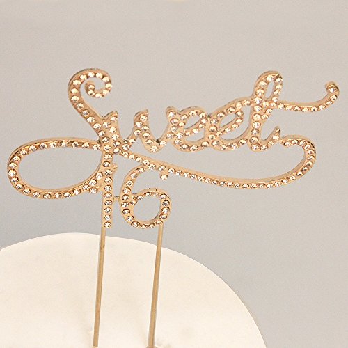 Sweet 16 Cake Topper for 16 Years Birthday Or 16TH Wedding Anniversary Gold Crystal Rhinestone Party Decoration (Gold)