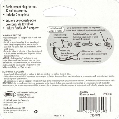 ReleaseDate : 2013-05-13 Studio : Bell Automotive Publisher : Bell Automotive Binding : Automotive Product Description Bell Automotive's Accessory Plug with Fuse Protection will power or charge your accessories and extend the cord length on your existing 12 volt products. Repair your broken 12 volt adapter with this replacement plug. Take on the road, and stay in style, with Bell Automotive's fashionable, functional and innovative accessories that will fulfill all your needs. 0