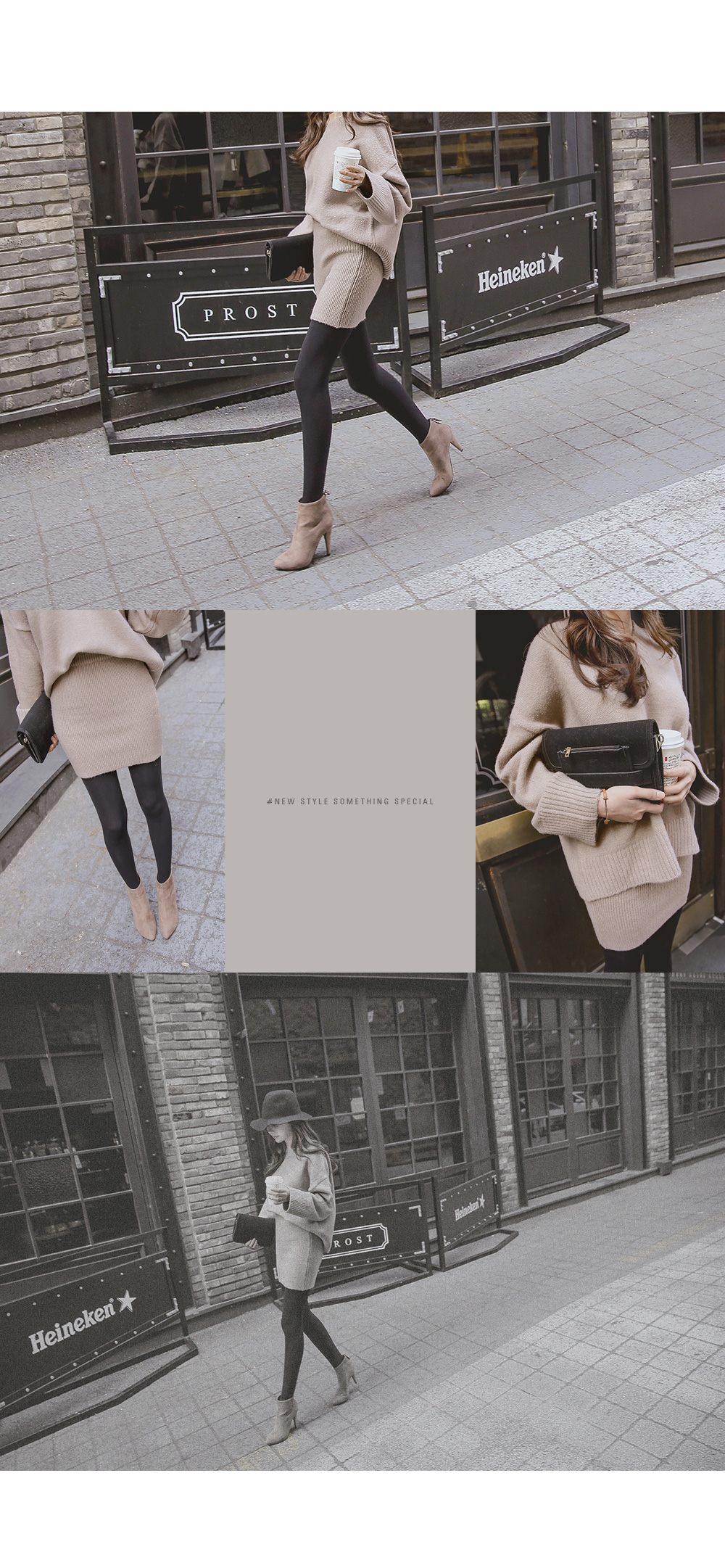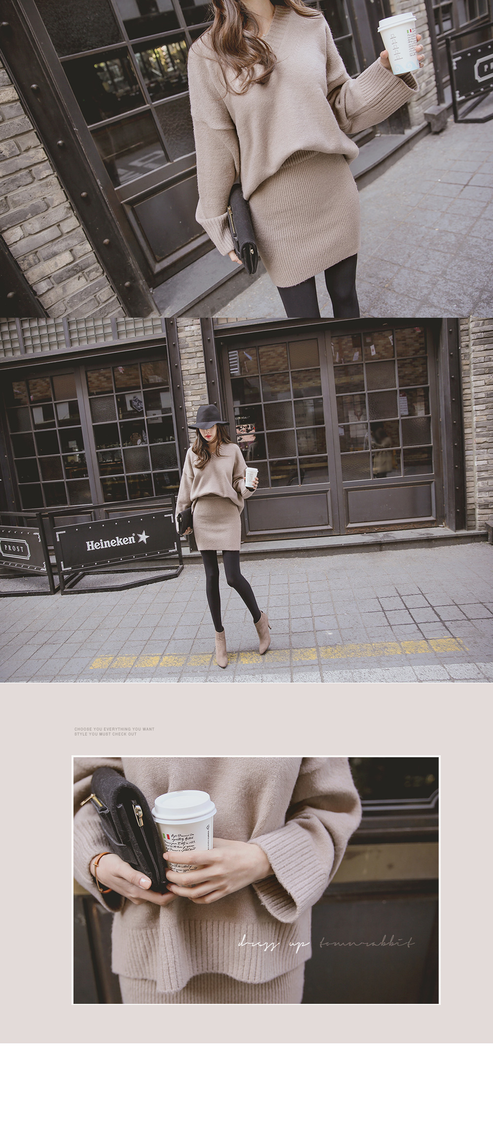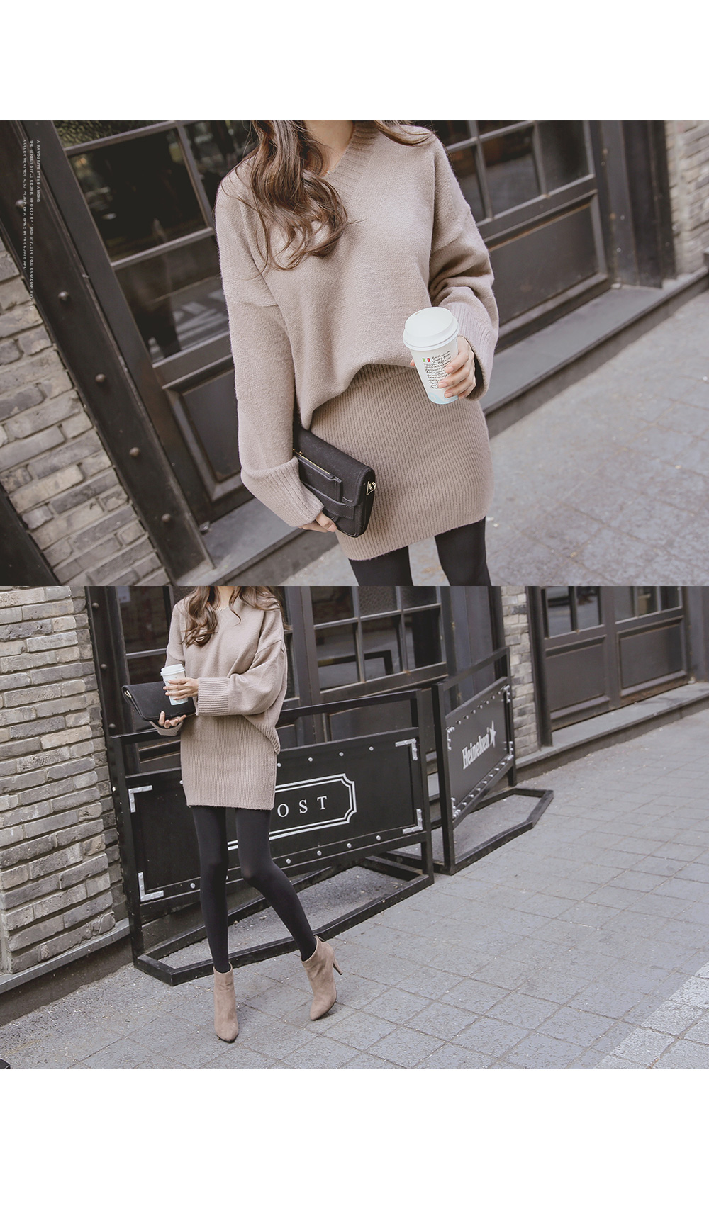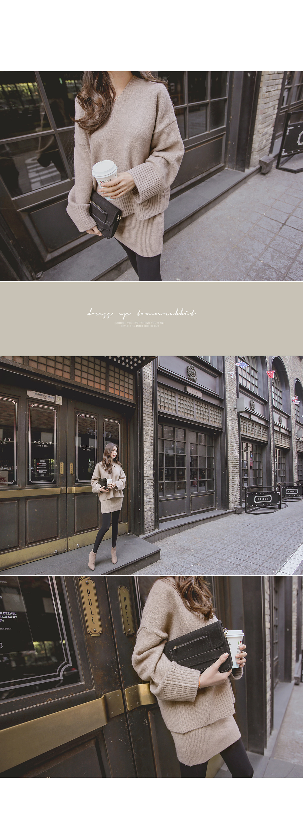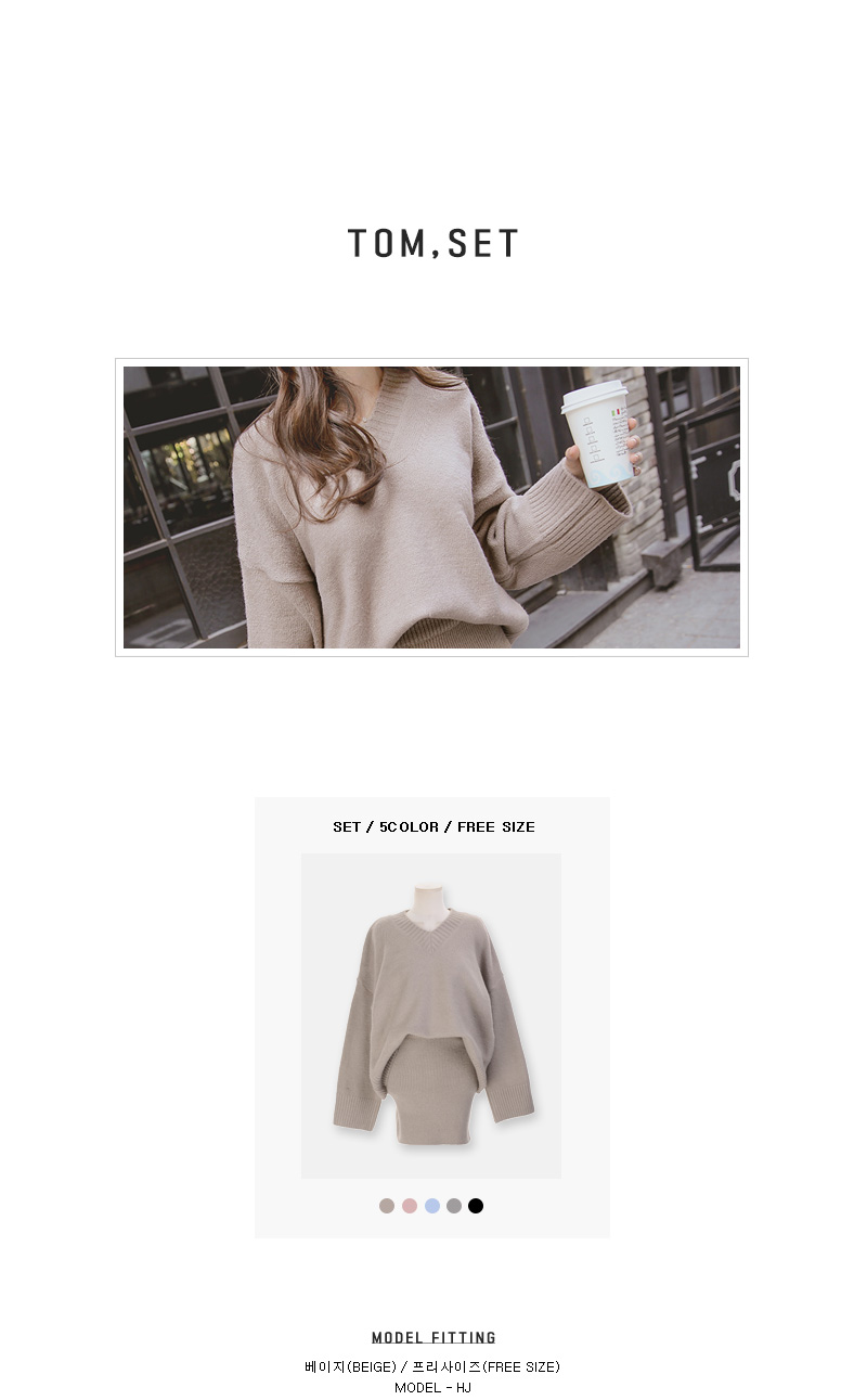 루즈핏 니트와 골지 니트 스커트가 세트로 구성된 아이템을 소개합니다.