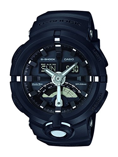 -. Feature : CASIO G-SHOCK watch GA-500-1AER, round sealed case 57,2 mm in black resin with mineral dial window, black dial with analog and digital display, black resin strap with buckle steel closure. Functions: stopwatch - 1/100 sec - 24 hours, timer - 1/1 sec. - 1 hour, 5 daily alarms, world time function, calendar day / date / month, weight approx 75 gr., 2 years international warranty of manufacturer. Brand new and delivered with genuine CASIO G-SCHOCK presentation box.