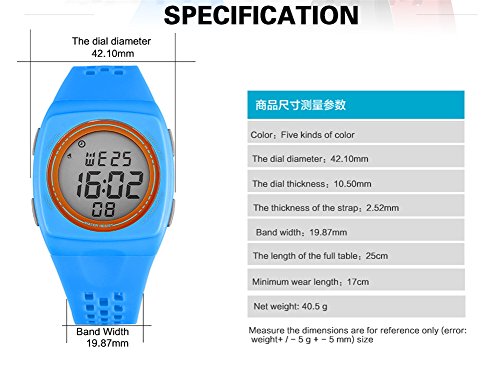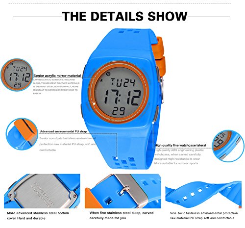 -. Feature : Fashion Kids Digital Watch-multiple color designed for Boys, perfect gift to your kids. / Waterproof -- 30M Waterproof, feel free to wear our watch for cleaning,showering, swimming and divings at the beach or doing yard work. Note: Don't press any key under water. / Multiple Functions: Luminous, alarm, 30m life waterproof, the whole point alarm, running seconds, week and date display, 12/24 hour system, meet the requirements your want. / High quilty with ABS quality watchcase, PU quality watch strap, Stainless steel chassis and Stainless steel buckle. / Shock Resistant: The excellent ABS Plastic case and Stainless Steel case back which enable the watch to be tough and durable.