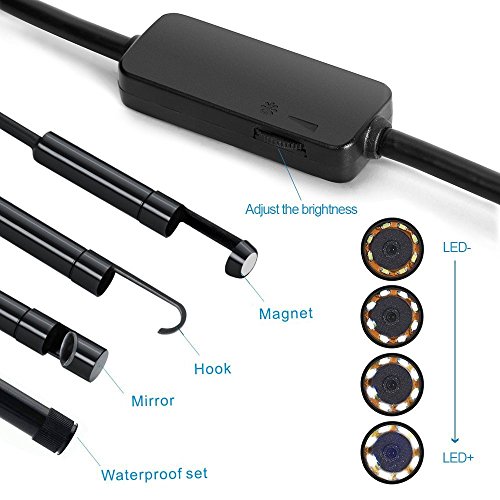 - Semi-rigid Extension Wire: The extension of the endoscope wire up to five meters, armed with bendable semi-rigid cable which can bend and hold it’s shape to access a wide variety of confined place. Such as low-light or dark area, damp or wet area etc. But Please do not put the endoscope in high temperature and corrosive environment.