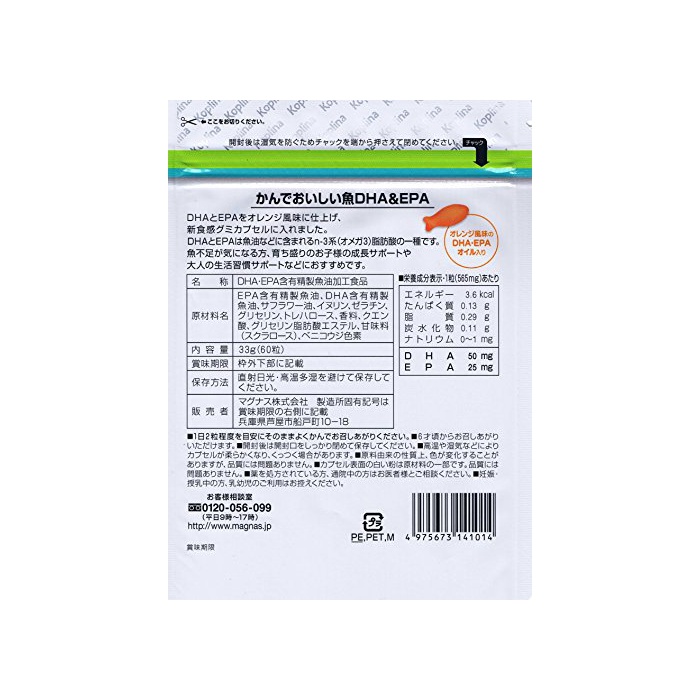 원재료:EPA함유 정제어유,DHA함유 정제어유,《사후라와》유,inulin,젤라틴,글리세린,트레이닝 헬로《스》,향료,구연산,글리세린 지방산 에스테르,감미료(《스쿠라로스》)고, 《베니코우지》색소