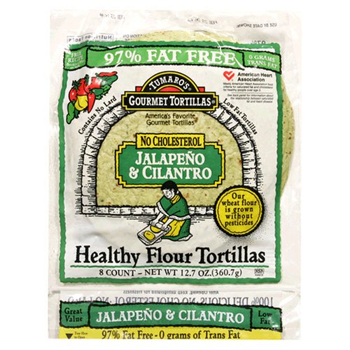 -. Feature : Case of six 12.7-ounce tortilla packages (total of 76.2 ounces) / Zesty flour tortillas seasoned with spicy jalapeno and cilantro / Low-fat; contains no saturated fat, trans fat, or cholesterol / Contains organic ingredients; American Heart Association Seal of Approval / Wholesome, gourmet tortillas made in the U.S.