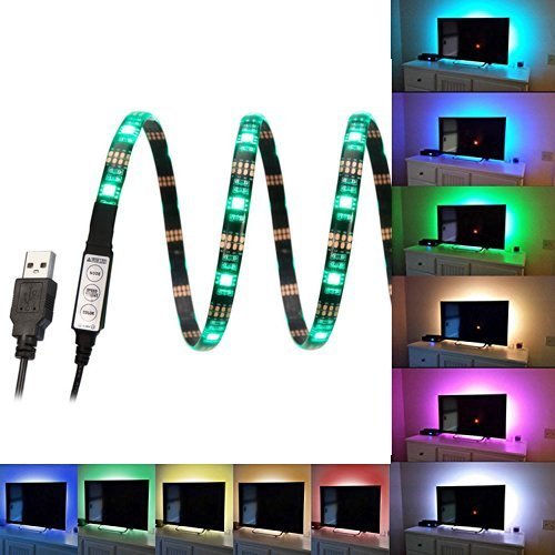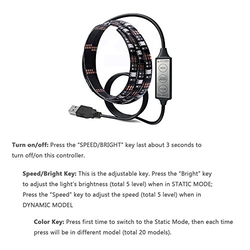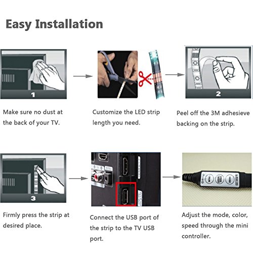 - ADJUSTABLE MULTI-COLOR SELECTION: The Led Strip is 35.4 Inch and can be cut with scissors on the cut marks to customize the desired size of your TV. Brightness, color and mode of the light can be adjusted through the mini controller on the end of the light strip.