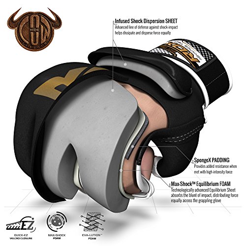 -. Feature : 100% authentic full grain cowhide leather built MMA gloves are strengthened with reinforced stitching for quality / Extra-thick foam based padding on knuckles with separate padded block over wrist-joint along with shock dissipating gel / Quick-EZ Velcro closure with extra-long strap provides enhanced wrist-support and a snug fit / Moisture wicking synthetic microfabric draws moisture away from skin enabling hand-comfort and breathability / Nabla-Palm architecture for ultimate grappling with special perforations on inner fingers and thumb sheath enhances moisture management