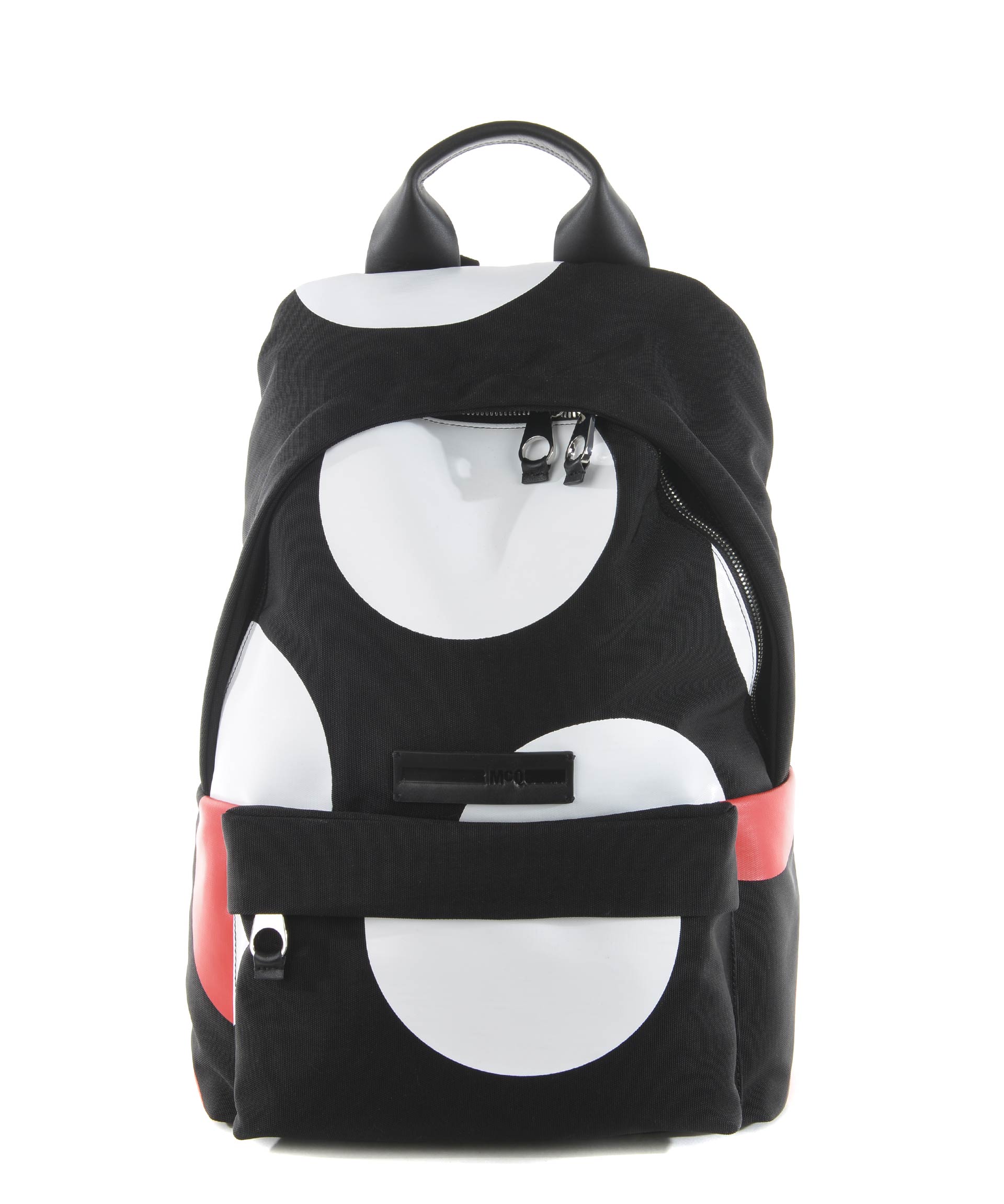 Zaino MCQ Alexander McQueen in nylon Nero. Stampa maxi pois Bianco/Rosso. Un manico in pelle. Spallacci in nylon regolabili. Tasca esterna con zip. Chiusura con zip. Tasca interna con zip e tasche applicate. Patch logo in pelle. Foderato.