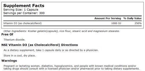 What is vitamin D?Vitamin D is a fat-soluble vitamin that is naturally present in very few food sources. Its functions in the body are wide ranging, from contributing to bone health to supporting immune function.Vitamin D3 (cholecalciferol) is the same form of vitamin D that the body manufactures when skin is exposed to ultraviolet (UV) radiation from the sun. Vitamin D3 may be more than three times as effective in raising concentrations of vitamin D in the bloodstream and maintaining those levels for a longer time.*How does vitamin D support health?Contributes to bone strength as proper levels create optimum conditions for bone formation.*Supports proper functioning of the immune and nervous systems.*Promotes the intestinal absorption of calcium.*Supports fetal skeletal development and tooth enamel formation.*Contributes to healthy levels of phosphorus in the body.*Why choose Vitacost Vitamin D3?Is the preferred form of vitamin D, identical to the type manufactured by the body when skin is exposed to UV sunlight.An ideal way to obtain vitamin D, as few foods contain vitamin D in sufficient quantity to meet Daily Value levels.Provides 1,000 IU of vitamin D3 per 1-capsule serving.Each bottle contains 300 servings.Incredible value!About VitacostAll Vitacost products are laboratory tested to meet FDA standards for identity, purity and composition. All products are tested for heavy metals, microbiology and contaminants. Vitacost products are produced in a NSF Certified facility. Freshness is guaranteed. *These statements have not been evaluated by the Food and Drug Administration. This product is not intended to diagnose, treat, cure or prevent any disease.Feature