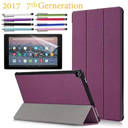 -. Feature : Compatible With New Amazon Fire HD 10" 7th Generation released in 2017 Only / Slim lightweight durable protective hardback with Premium Synthetic Leather with Soft scratch-free microfiber interior combine with rigid poly-carbonate back shell brings you a solid case. / Folding cover transforms the case to be a stand with two comfortable viewing angles: Watching/view angle and typing angle. / Specifically-cut for access to all buttons and ports, Prevents scratches and damages to your New Amazon Fire HD 10" 7th Generation released in 2017 / Package include 1 Fire HD 10" Clear Screen Protector and 1 Random Color Stylus