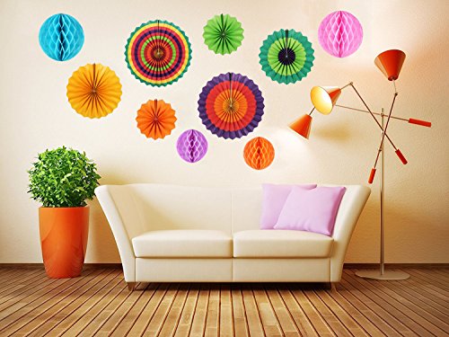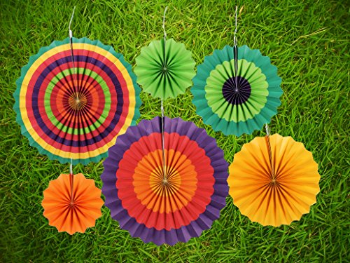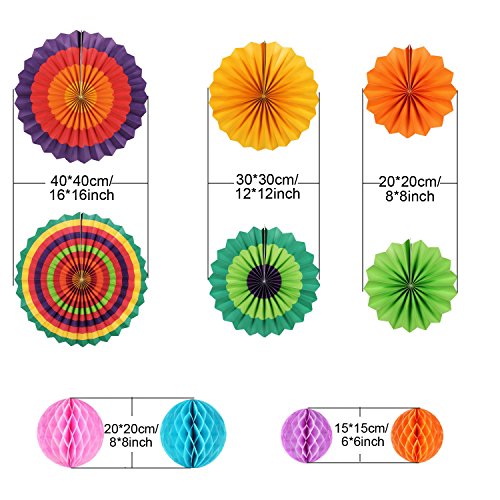 - ASSORTED SIZES AND BRIGHT COLORS-- Fiesta Paper Fans include 2pcs 8 inches, 2pcs 12inches, and 2 pcs 16 inches fans with vibrant colors and strips; Honeycomb Balls include 2pcs 6 inches, and 2pcs 8 inches balls with different bright color. -----The packaging includes: 6 pcs paper fans and 4 pcs honeycomb balls with different size and colors.