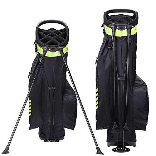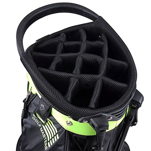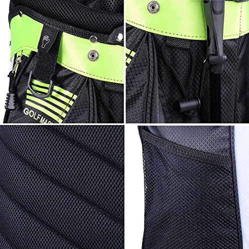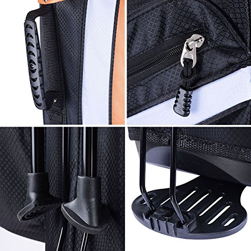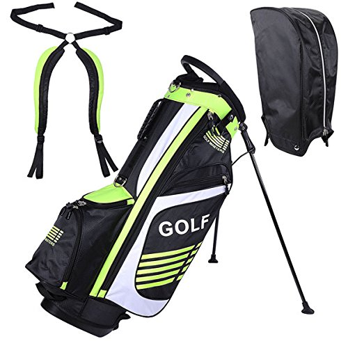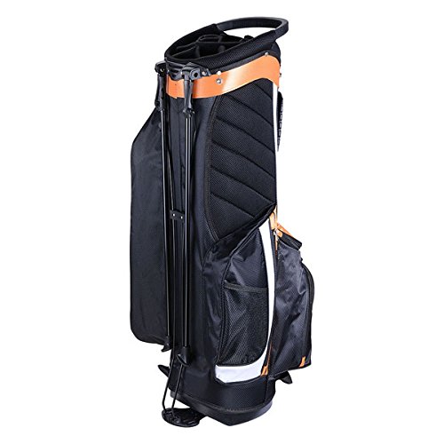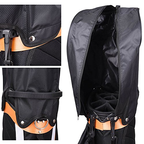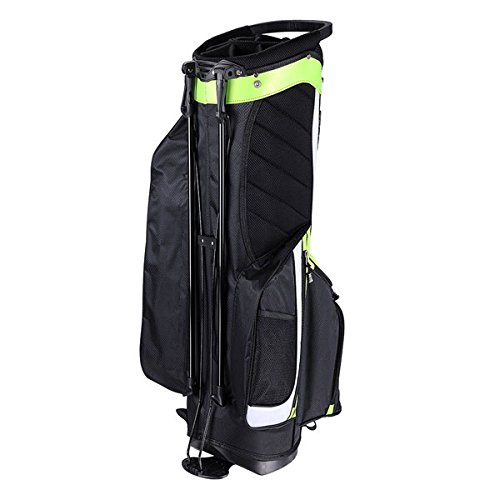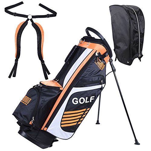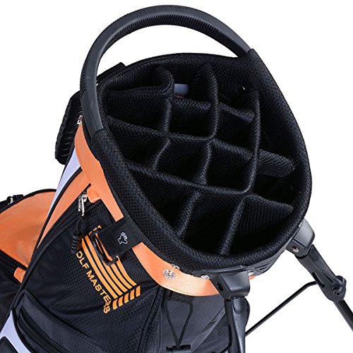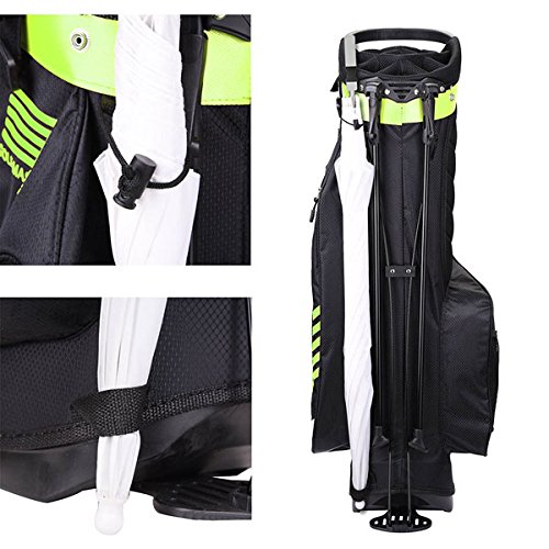 Features: Two (2) sliding shoulder pads with adjustable straps Metal stand Bag Material: Rugged 600D Nylon Fabric High hardness plastic base 14-way divider (8.27" x 10.24") with comfortable plastic handle Seven (7) pockets Specifications: Product Size: 16.5"(L) x 11"(W) x 35.4"(H) Weight: Approximately 5 lbs. Metal stand leg: 26" in length, 0.73" in diameter, spanned up to 24" in width Base size: 11" x 7.87" Package Contents: 1x Golf stand/carry bag 1x Bag Cap 0
