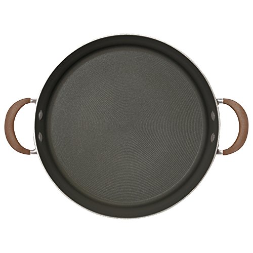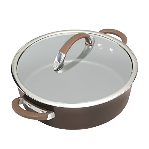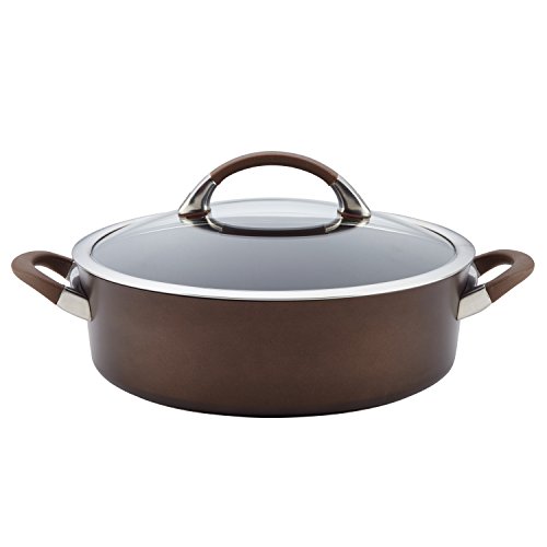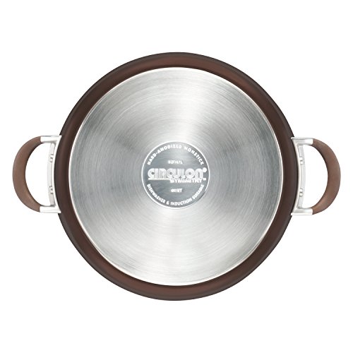 Sure to become a go-to pan for kitchen efficiency, this generous Circular Symmetry(tm) Chocolate hard-anodized nonstick 5-quart covered sautes cooks like a Pro. The sautes pan features heavy-duty hard-anodized aluminum construction that's twice as hard as stainless steel for long-lasting durability. Unique to Circular cookware, the PFOA-free total nonstick system combines metal-utensil-safe premium-quality nonstick with a cooking surface of raised circles to reduce surface abrasion. This superior nonstick technology resists scratching, staining and chipping, and provides extraordinary food release without the need for added oils. And Circular Symmetry(tm) Chocolate cookware looks as delicious as it cooks, with richly-colored exterior Color and an elegant Tulip shape. This dishwasher safe saute pan complements many other items in the Circular collections. Prepare a pasta toss or saute a light and healthy medley of fresh string beans, baby carrots and onions in this handy stovetop piece. Graceful cast stainless steel handles are rubberized to provide a comfortable grasp. A shatter-resistant glass lid has a wide stainless steel rim and allows foods to be monitored without losing heat or moisture. Oven safe to 400 Degree, the pan is fitted with an impact-bonded stainless steel base suitable for all stovetops, including induction. Cooking with Chocolate takes on a whole new meaning of kitchen efficiency with the Circular Symmetry(tm) Chocolate hard-anodized nonstick 5-quart covered sautes.Feature