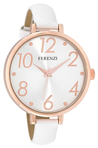 Ferenzi Women's | Large Modern Easy Read Silver Face Thin White Band Rose Gold Watch | FZ16105