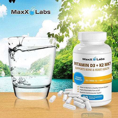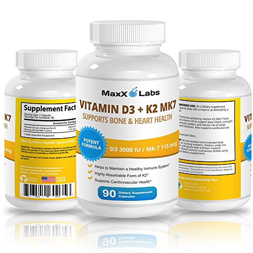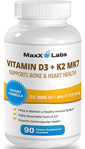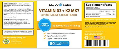 -. Binding : Health and Beauty -. Brand : MaxX Labs -. EAN : 0703510600356 -. Feature : ✔ HELPS TO MAINTAIN A HEALTHY IMMUNE SYSTEM / ✔ SUPPLEMENTS SUPPORT CARDIOVASCULAR HEALTH / ✔ HIGHLY ABSORBABLE FORM OF K2 SUPPLEMENT / ✔ POTENT FORMULA WITH 3,000IU of D3 and 115mcg OF K2 MK-7 (NATTO) / ✔ YOUR UNCONDITIONAL 100% SATISFACTION IS OUR GUARANTEE -. IsAdultProduct : 0 -. Label : MaxX Labs -. Manufacturer : MaxX Labs -. Model : ML-Vitamin-D3-K2-MK7-90ct-fba -. MPN : ML-Vitamin-D3-K2-MK7-90ct-fba -. PackageQuantity : 1 -. PartNumber : ML-Vitamin-D3-K2-MK7-90ct-fba -. ProductGroup : Health and Beauty -. ProductTypeName : HEALTH_PERSONAL_CARE -. Publisher : MaxX Labs -. Studio : MaxX Labs -. Title : Vitamin D3 with Vitamin K2 MK-7 ★ New ★ Full 3,000 IU Per Capsule Plus 115mcg MK7 from Natto - Natural, Effective, Safe - Supports Bone and Heart Health - Gluten Free - 90 Capsules -. UPC : 703510600356