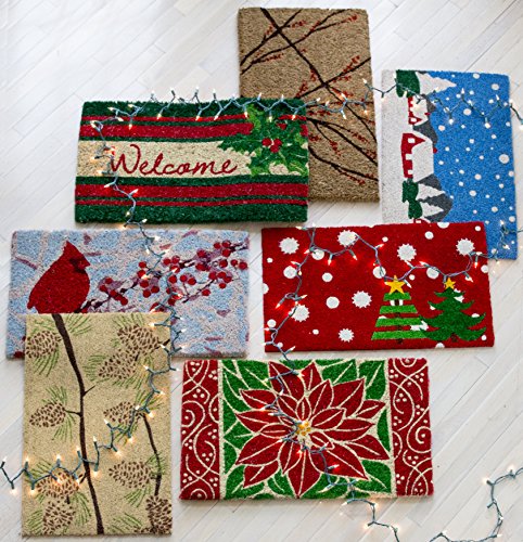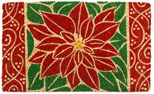 No flower says Christmas like the poinsettia! The timeless holiday flower is bordered with a whimsical motif, adding a celebratory feeling to this beautifully crafted doormat. Entryways doormats are crafted to the industry’s highest standards. Woven of coir, they are made and painted by hand. They measure 18” x 30” and are 3/4” thick.Greet your visitors with this eye-catching door mat. Handcrafted of 100% all natural coir with fade resistant dyes. Hand-woven by artisans in India - supports a cottage industry. Removes dirt, debris, mud and moisture from your shoes. Because each doormat is handmade of all natural products - sizes and colors will vary slightly. Intended for outdoor use. Best location is under a covered area. Due to the nature of the natural Coir fiber, shedding may occur, but over time this will lessen. Sweep or shake to clean.Feature