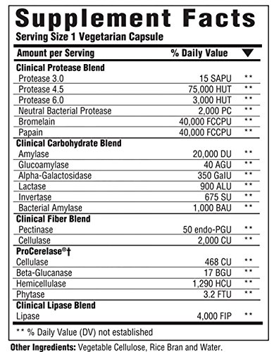 COMPREHENSIVE ENZYME FORMULATION: Digestive Enzymes Clinical Strength includes ProCerelase, an exclusive combination of hemicellulase, beta-glucanase, cellulase, and phytase. These four enzymes may support improved digestibility of fruits and vegetables. This unique formula also features differing pH tolerant proteases assuring the effectiveness of the formula as the enzymes move through the gut.