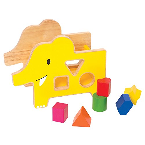 Wooden toddler toy features an elephant sorter and 6 wooden shapes